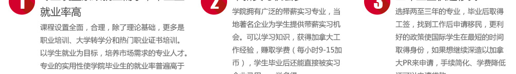 加拿大的公立学院有150多所,遍布全国各地。一般来说,学院都是小班教学。在加拿大绝大部分学院都与大学有合作关系,承担着为大学输送学生的任务。学院的大部分专业都与大学相应专业互相承认学分,学院设置的大学转学分课程可以让学生将学院的学分带进大学。学生完成学院的课程后,可以继续到大学深造,毕业后同时拥有学院的职业文凭和大学的学士学位。这种职业文凭及学士学位兼备的学生,既有扎实的理论基础知识,又有很强的实践动手能力,常常是企业需要也是竞争力强的人才。